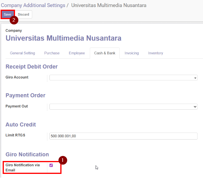 2. Pada Tab Cash & Bank, Centang Giro Notification via Email dan Klik Save